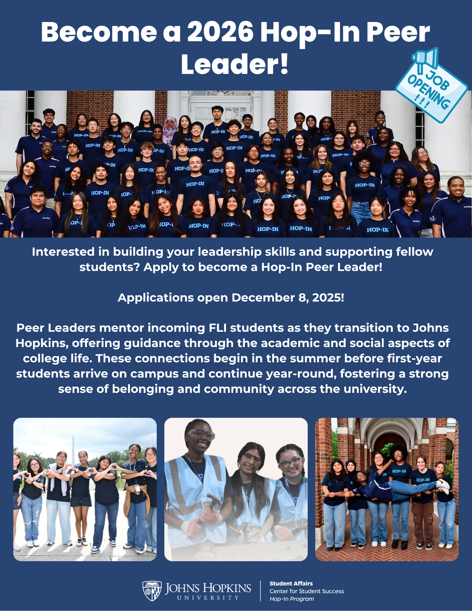 Hop-In is a 5-week summer program that allows a cohort of entering first-generation and limited-income/Pell-eligible (FLI) students to build community & experience academic and social life at Johns Hopkins University prior to beginning their fall semester. This program offers enrichment opportunities for students to develop professionally and personally as leaders at Hopkins. All incoming participants will have access to an upper-class peer mentor, exposure to various academic support resources and opportunities to interact with faculty.